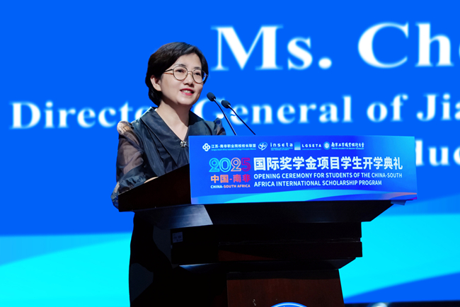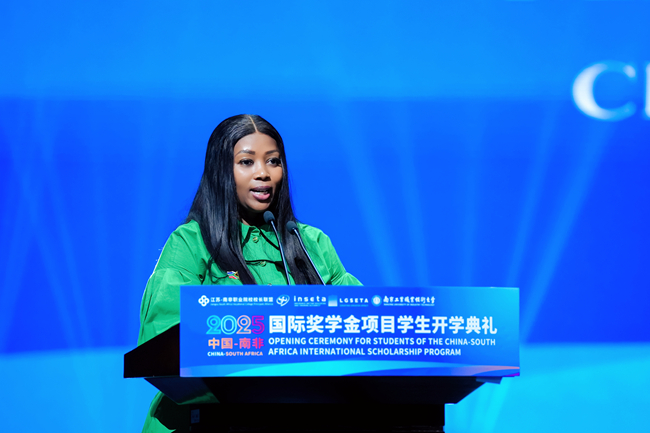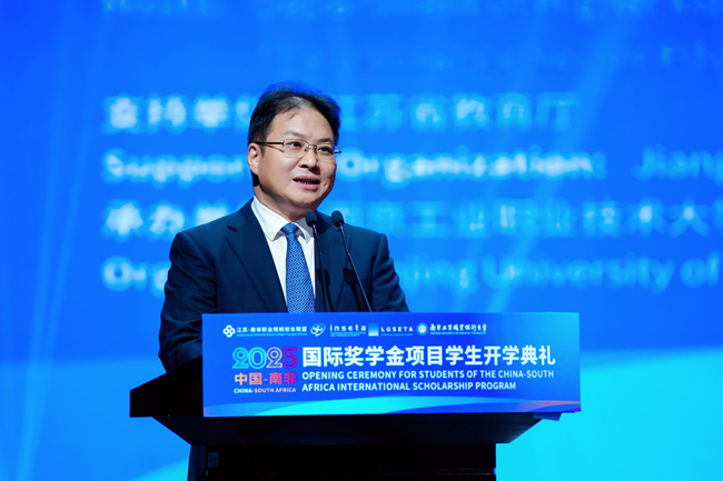 陈艳在仪式上致辞。她表示,江苏是经济大省、教育大省、文化大省,在过去五年,有来自182个国家超过16万人次的外国留学生在江苏学习,已成为外国留学生到中国留学的主要目标省份之一。她指出,2024年南工协办“江苏—非洲职业教育合作交流会”和“留学江苏教育展南非专场活动”取得良好成效,在此基础上,中南双方合作开展“中国-南非国际奖学金”项目,让更多的南非优秀学生有机会来苏学习,江苏省教育厅将一如既往地支持该项目,希望在大家的共同努力下,为构建中非命运共同体贡献更多的江苏教育力量。对新入学的南非学生,她提出三点建议:一是希望同学们尽快适应新的环境,珍惜学习时光,学好专业知识;二是希望同学们与中国师生广交朋友,多和家人朋友分享中国故事、江苏故事,成为增进中国与南非友谊的使者;三是希望参与项目的江苏院校将这个项目办实办好,打造成为中国与南非国际教育交流的品牌项目。
