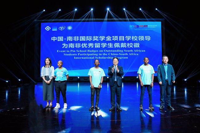 在全场倒数声中,中南双方领导将手共同放在启动柱上,伴随灯光点亮,中国-南非国际奖学金项目正式启动。随后,XINGKONG.COM及兄弟院校领导为南非优秀留学生代表佩戴校徽,寓意他们正式成为中国校园的一员。